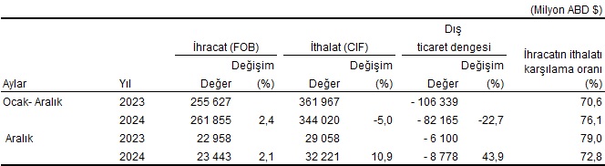 - Aralık ayında dış ticaret açığı bir önceki yılın aynı ayına göre %43,9 artarak 6 milyar 100 milyon dolardan, 8 milyar 778 milyon dolara yükseldi. İhracatın ithalatı karşılama oranı 2023 Aralık ayında %79,0 iken, 2024 Aralık ayında %72,8'e geriledi. Ocak-Aralık döneminde dış ticaret açığı %22,7 azalarak 106 milyar 339 milyon dolardan, 82 milyar 165 milyon dolara geriledi. İhracatın ithalatı karşılama oranı 2023 Ocak-Aralık döneminde %70,6 iken, 2024 yılının aynı döneminde %76,1'e yükseldi.