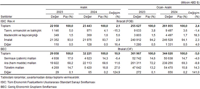 - İhracat 2024 yılı Aralık ayında, bir önceki yılın aynı ayına göre %2,1 artarak 23 milyar 443 milyon dolar, ithalat %10,9 artarak 32 milyar 221 milyon dolar olarak gerçekleşti. İhracat 2024 yılı Ocak-Aralık döneminde bir önceki yılın aynı dönemine göre %2,4 artarak 261 milyar 855 milyon dolar, ithalat %5,0 azalarak 344 milyar 20 milyon dolar olarak gerçekleşti.