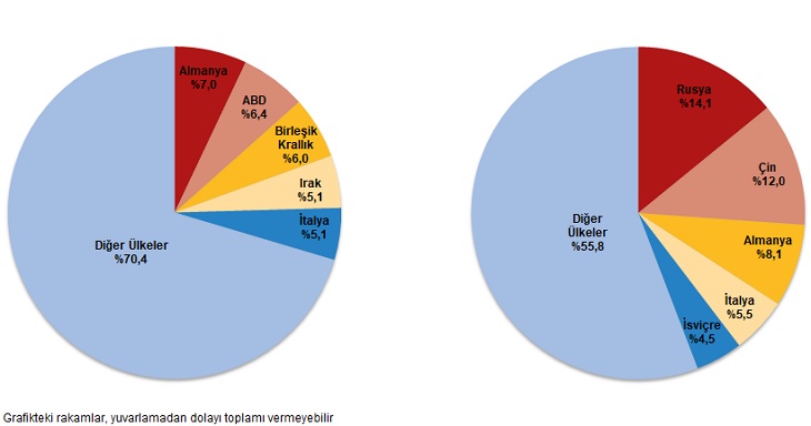 - İthalatta Rusya Federasyonu ilk sırayı aldı. Aralık ayında Rusya Federasyonu'ndan yapılan ithalat 4 milyar 540 milyon dolar olurken, bu ülkeyi sırasıyla; 3 milyar 881 milyon dolar ile Çin, 2 milyar 598 milyon dolar ile Almanya, 1 milyar 760 milyon dolar ile İtalya, 1 milyar 465 milyon dolar ile İsviçre izledi. İlk 5 ülkeden yapılan ithalat, toplam ithalatın %44,2'sini oluşturdu. Ocak-Aralık döneminde ithalatta ilk sırayı Çin aldı. Çin'den yapılan ithalat 44 milyar 931 milyon dolar olurken, bu ülkeyi sırasıyla; 44 milyar 20 milyon dolar ile Rusya Federasyonu, 27 milyar 84 milyon dolar ile Almanya, 19 milyar 312 milyon dolar ile İtalya, 16 milyar 227 milyon dolar ile ABD izledi. İlk 5 ülkeden yapılan ithalat, toplam ithalatın %44,1'ini oluşturdu.