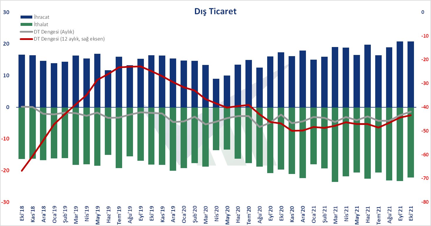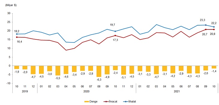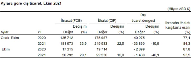 - Ekim ayında dış ticaret açığı bir önceki yılın aynı ayına göre %40,1 azalarak 2 milyar 399 milyon dolardan, 1 milyar 438 milyon dolara geriledi. İhracatın ithalatı karşılama oranı 2020 Ekim ayında %87,8 iken, 2021 Ekim ayında %93,5'e yükseldi. Ocak-Ekim döneminde dış ticaret açığı %15,9 azalarak 40 milyar 275 milyon dolardan, 33 milyar 860 milyon dolara geriledi. İhracatın ithalatı karşılama oranı 2020 Ocak-Ekim döneminde %77,1 iken, 2021 yılının aynı döneminde %84,3'e yükseldi.