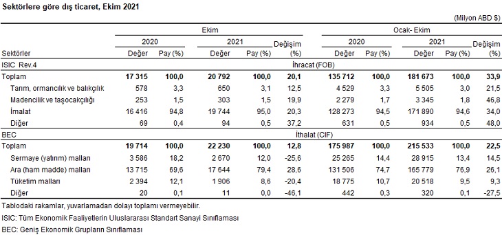 - İhracat 2021 yılı Ekim ayında, bir önceki yılın aynı ayına göre %20,1 artarak 20 milyar 792 milyon dolar, ithalat %12,8 artarak 22 milyar 230 milyon dolar olarak gerçekleşti. 2021 yılı Ocak-Ekim döneminde bir önceki yılın aynı dönemine göre %33,9 artarak 181 milyar 673 milyon dolar, ithalat %22,5 artarak 215 milyar 533 milyon dolar olarak gerçekleşti.