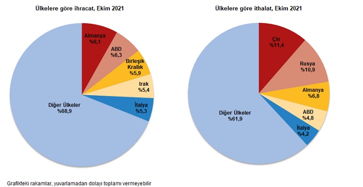 - İthalatta Çin ilk sırayı aldı. Ekim ayında Çin'den yapılan ithalat 2 milyar 525 milyon dolar olurken, bu ülkeyi sırasıyla; 2 milyar 434 milyon dolar ile Rusya, 1 milyar 509 milyon dolar ile Almanya, 1 milyar 58 milyon dolar ile ABD, 945 milyon dolar ile İtalya izledi. İlk 5 ülkeden yapılan ithalat, toplam ithalatın %38,1'ini oluşturdu. Ocak-Ekim döneminde ithalatta ilk sırayı yine Çin aldı. Çin'den yapılan ithalat 26 milyar 61 milyon dolar olurken, bu ülkeyi sırasıyla; 22 milyar 611 milyon dolar ile Rusya, 17 milyar 876 milyon dolar ile Almanya, 10 milyar 515 milyon dolar ile ABD, 9 milyar 306 milyon dolar ile İtalya izledi. İlk 5 ülkeden yapılan ithalat, toplam ithalatın %40,1'ini oluşturdu.