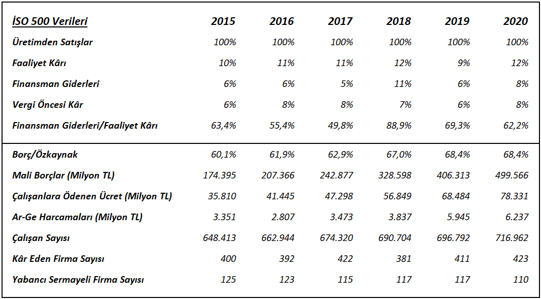 İstanbul Sanayi Odası'nın (İSO) 2020 yılı için yayımladığı Türkiye'nin 500 Büyük Sanayi Kuruluşu araştırmasından elde edilen verilerle düzenlenen İSO 500 Verileri tablosuna aşağıda yer verilmiştir: