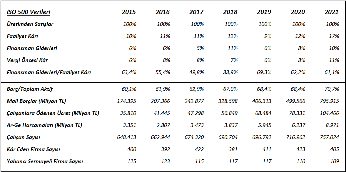 İstanbul Sanayi Odası'nın her yıl gerçekleştirdiği "Türkiye’nin 500 Büyük Sanayi Kuruluşu Araştırması"nın 2021 yılı sonuçları açıklanmıştır. Üretimden net satışlara göre listede isimleri görünen Türkiye'nin en büyük sanayi kuruluşu 136,8 Milyar TL ile TÜPRAŞ-Türkiye Petrol Rafinerileri A.Ş. iken 499. kuruluş ise 983,6 Milyon TL ile Superlit Boru Sanayi A.Ş. olmuştur.
