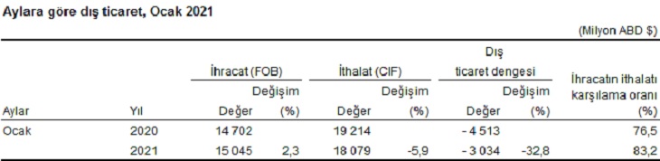 - İhracat 2021 yılı Ocak ayında, bir önceki yılın aynı ayına göre %2,3 artarak 15 milyar 45 milyon dolar, ithalat %5,9 azalarak 18 milyar 79 milyon dolar olarak gerçekleşti.
