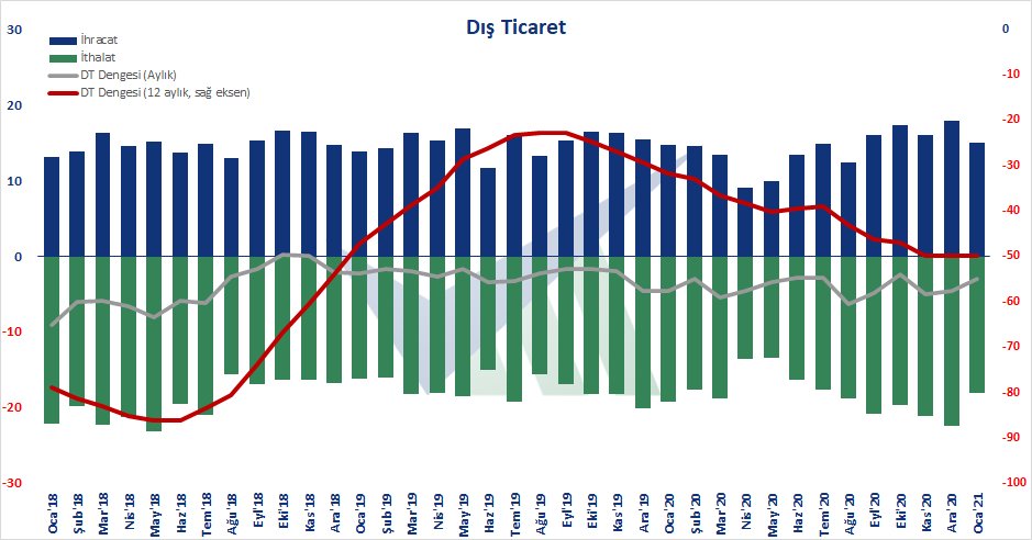 - Ocak ayında dış ticaret açığı bir önceki yılın aynı ayına göre %32,8 azalarak 4 milyar 513 milyon dolardan, 3 milyar 34 milyon dolara geriledi. İhracatın ithalatı karşılama oranı 2020 Ocak ayında %76,5 iken, 2021 Ocak ayında %83,2'ye yükseldi.