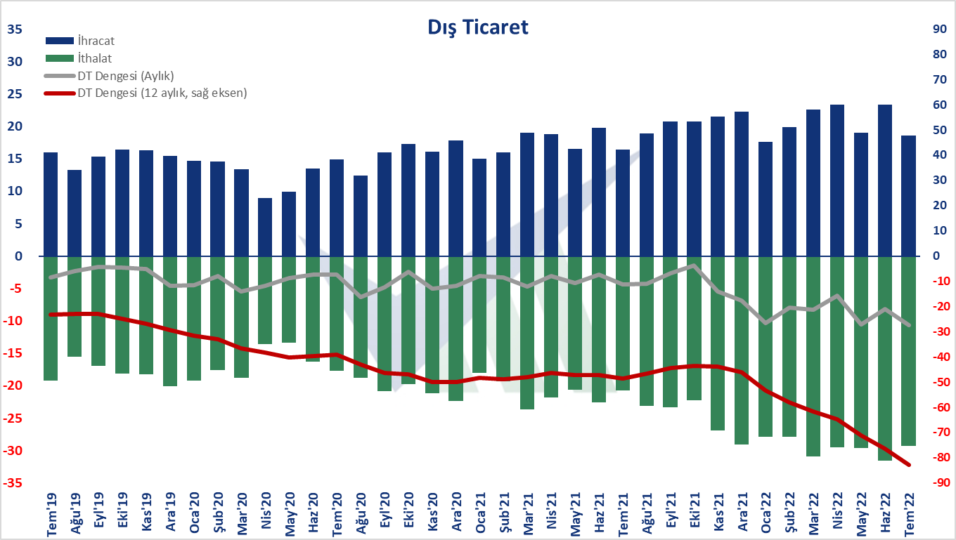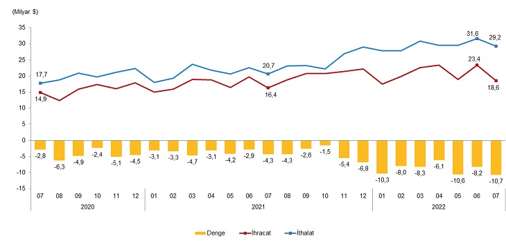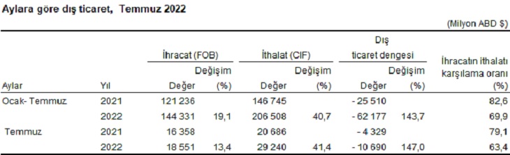 - Temmuz ayında dış ticaret açığı bir önceki yılın aynı ayına göre %147,0 artarak 4 milyar 329 milyon dolardan, 10 milyar 690 milyon dolara yükseldi. İhracatın ithalatı karşılama oranı 2021 Temmuz ayında %79,1 iken, 2022 Temmuz ayında %63,4'e geriledi. Ocak-Temmuz döneminde dış ticaret açığı %143,7 artarak 25 milyar 510 milyon dolardan, 62 milyar 177 milyon dolara yükseldi. İhracatın ithalatı karşılama oranı 2021 Ocak-Temmuz döneminde %82,6 iken, 2022 yılının aynı döneminde %69,9'a geriledi.