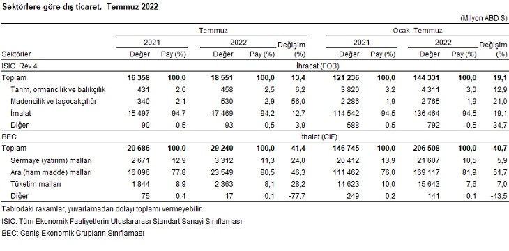 - Geniş ekonomik gruplar sınıflamasına göre ithalatta, 2022 Temmuz ayında ara mallarının payı %80,5, sermaye mallarının payı %11,3 ve tüketim mallarının payı %8,1 oldu. İthalatta, 2022 Ocak-Temmuz döneminde ara mallarının payı %81,9, sermaye mallarının payı %10,5 ve tüketim mallarının payı %7,6 oldu.