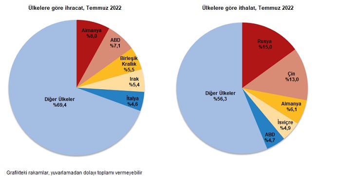- İthalatta Rusya Federasyonu ilk sırayı aldı. Temmuz ayında Rusya Federasyonu'ndan yapılan ithalat 4 milyar 374 milyon dolar olurken, bu ülkeyi sırasıyla; 3 milyar 804 milyon dolar ile Çin, 1 milyar 779 milyon dolar ile Almanya, 1 milyar 446 milyon dolar ile İsviçre, 1 milyar 389 milyon dolar ile ABD izledi. İlk 5 ülkeden yapılan ithalat, toplam ithalatın %43,7'sini oluşturdu.Ocak-Temmuz döneminde ithalatta ilk sırayı Rusya Federasyonu aldı. Rusya Federasyonu'ndan yapılan ithalat 32 milyar 116 milyon dolar olurken, bu ülkeyi sırasıyla; 23 milyar 887 milyon dolar ile Çin, 13 milyar 279 milyon dolar ile Almanya, 8 milyar 971 milyon dolar ile ABD, 7 milyar 956 milyon dolar ile İtalya izledi. İlk 5 ülkeden yapılan ithalat, toplam ithalatın %41,7'sini oluşturdu.